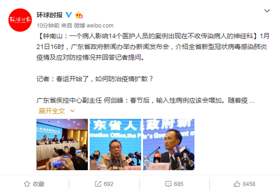 [钟南山:一个病人影响14个医护人员的案例出现在不收传染病人的神经科]1月21日16时,广东省政府新闻办举办新闻发布会,介绍全省新型冠状病毒感染肺炎疫情及应对防控情况并回答记者提问。