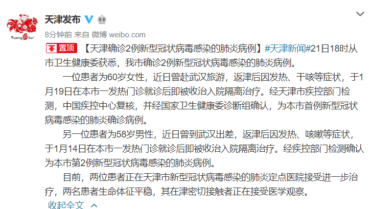 荔枝新闻讯 据天津市人民政府新闻办公室官方微博消息,21日18时记者从市卫生健康委获悉,我市确诊2例新型冠状病毒感染的肺炎病例。