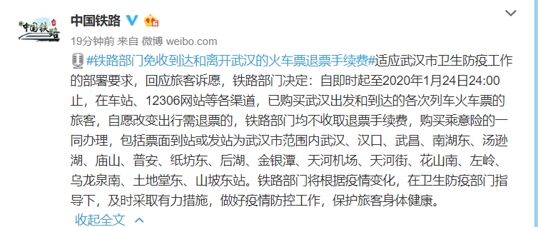 适应武汉市卫生防疫工作的部署要求,回应旅客诉愿,铁路部门决定:自即时起至2020年1月24日24:00止,在车站、12306网站等各渠道,已购买武汉出发和到达的各次列车火车票的旅客,自愿改变出行需退票的,铁路部门均不收取退票手续费,购买乘意险的一同办理,包括票面到站或发站为武汉市范围内武汉、汉口、武昌、南湖东、汤逊湖、庙山、普安、纸坊东、后湖、金银潭、天河机场、天河街、花山南、左岭、乌龙泉南、土地堂东、山坡东站。