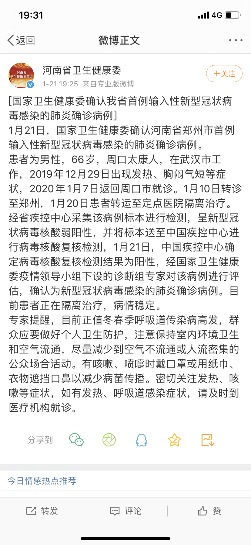 患者为男性,66岁,周口太康人,在武汉市工作,2019年12月29日出现发热、胸闷气短等症状,2020年1月7日返回周口市就诊。1月10日转诊至郑州,1月20日患者转运至定点医院隔离治疗。经省疾控中心采集该病例标本进行检测,呈新型冠状病毒核酸弱阳性,并将标本送至中国疾控中心进行病毒核酸复核检测,1月21日,中国疾控中心确定病毒核酸复核检测结果为阳性,经国家卫生健康委疫情领导小组下设的诊断组专家对该病例进行评估,确认为新型冠状病毒感染的肺炎确诊病例。目前患者正在隔离治疗,病情稳定。