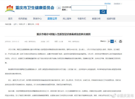 1月21日晚,国家卫生健康委确认重庆市首例输入性新型冠状病毒感染的肺炎确诊病例。患者为44岁女性,巫山县人, 1月15日自武汉返回巫山县后,因发热、乏力等症状,于当日在巫山县一发热门诊就诊后即被收治入院隔离治疗。经重庆市疾控部门检测,患者标本呈新型冠状病毒核酸阳性。1月20日,将标本送中国疾控中心进行核酸检测复核为阳性。1月21日,经国家卫生健康委疫情领导小组下设的诊断组专家评估确认为新型冠状病毒感染的肺炎确诊病例。现患者体温正常,生命体征平稳,密切接触者正在医学观察。