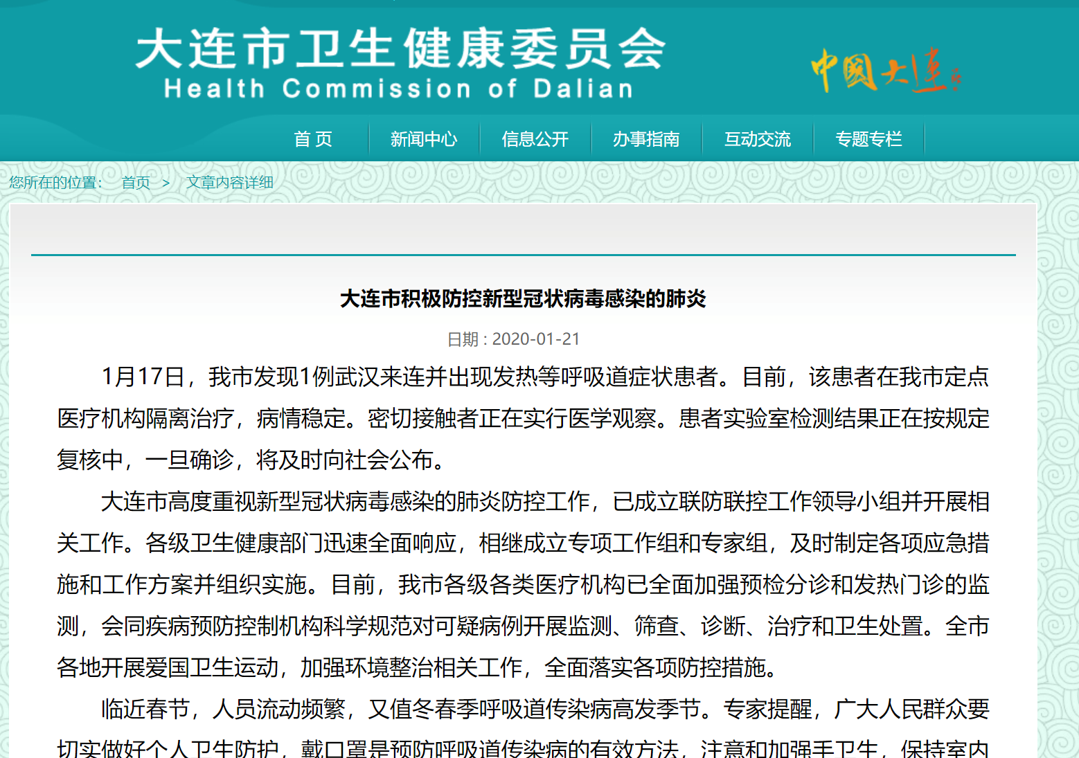 荔枝新闻讯 据大连市卫健委21日消息:1月17日,我市发现1例武汉来连并出现发热等呼吸道症状患者。目前,该患者在我市定点医疗机构隔离治疗,病情稳定。密切接触者正在实行医学观察。患者实验室检测结果正在按规定复核中,一旦确诊,将及时向社会公布。
