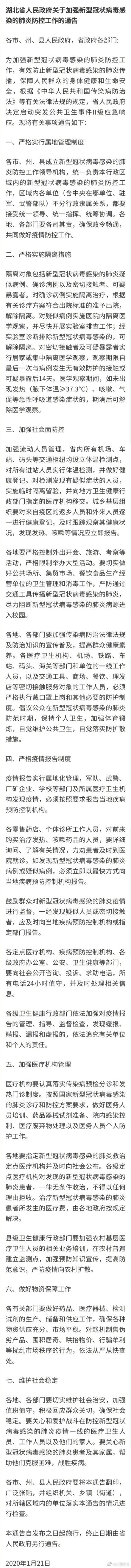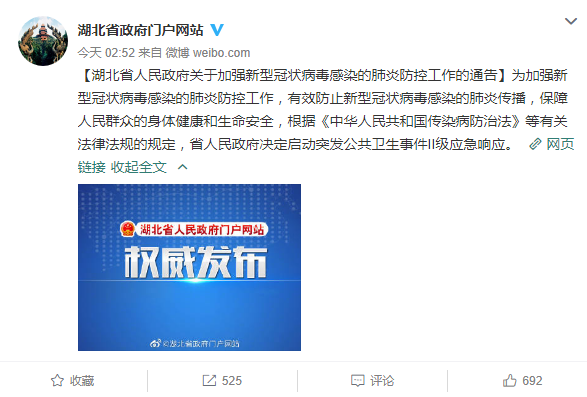 荔枝新闻讯 1月22日2:40,湖北省人民政府发布关于加强新型冠状病毒感染的肺炎防控工作的通告:为加强新型冠状病毒感染的肺炎防控工作,有效防止新型冠状病毒感染的肺炎传播,保障人民群众的身体健康和生命安全,根据《中华人民共和国传染病防治法》等有关法律法规的规定,省人民政府决定启动突发公共卫生事件II级应急响应。