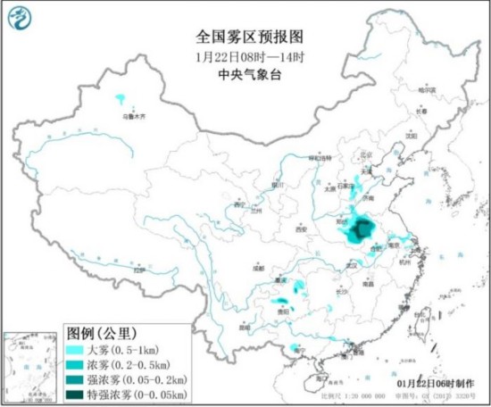 中央气象台1月22日6时继续发布大雾黄色预警: