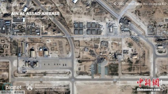 当地时间1月8日,卫星图像显示,伊拉克西部的Ain al-Asad美国空军基地在受到来自伊朗的火箭袭击后部分建筑物明显受损。