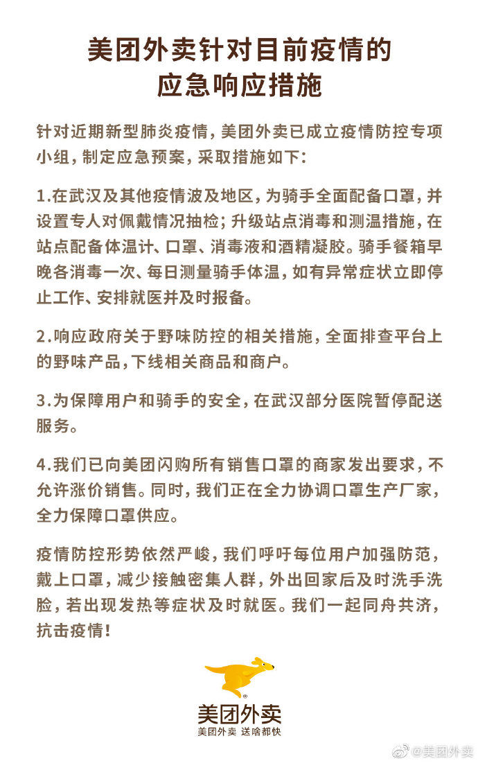 荔枝新闻讯 1月22日美团外卖发布消息,公布了针对新型冠状病毒感染的肺炎疫情的应急响应措施。