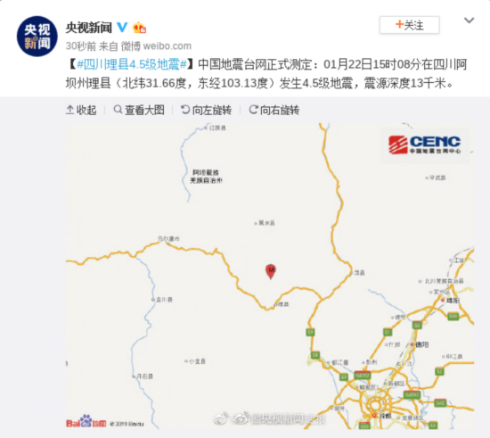 中国地震台网正式测定:01月22日15时08分在四川阿坝州理县(北纬31.66度,东经103.13度)发生4.5级地震,震源深度13千米。