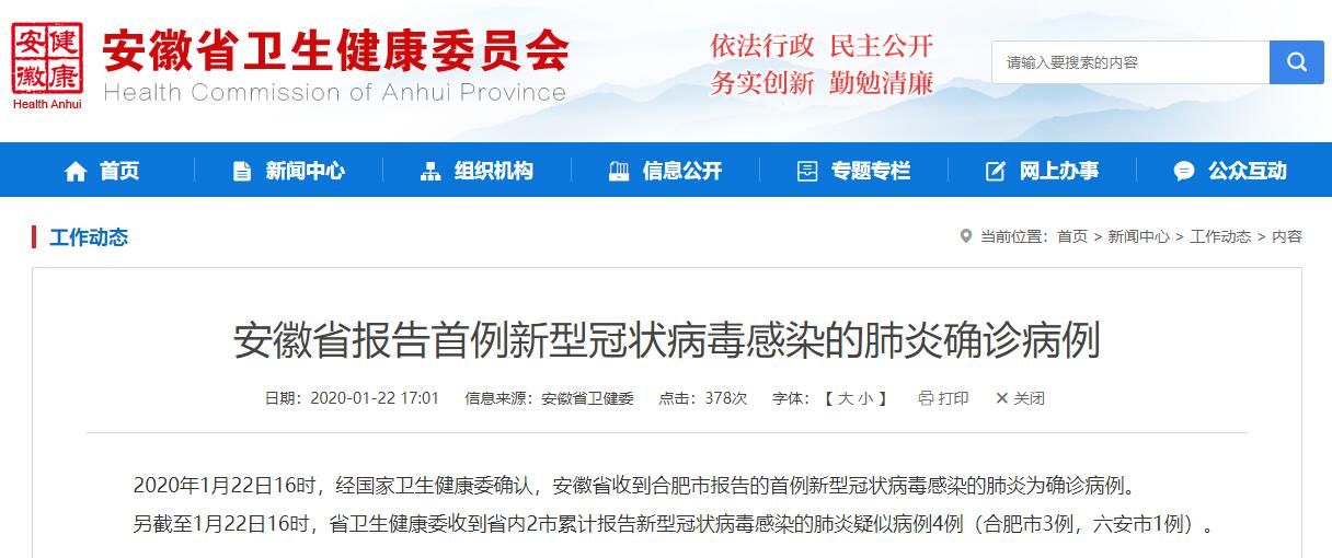 荔枝新闻讯 2020年1月22日16时,经国家卫生健康委确认,安徽省收到合肥市报告的首例新型冠状病毒感染的肺炎为确诊病例。