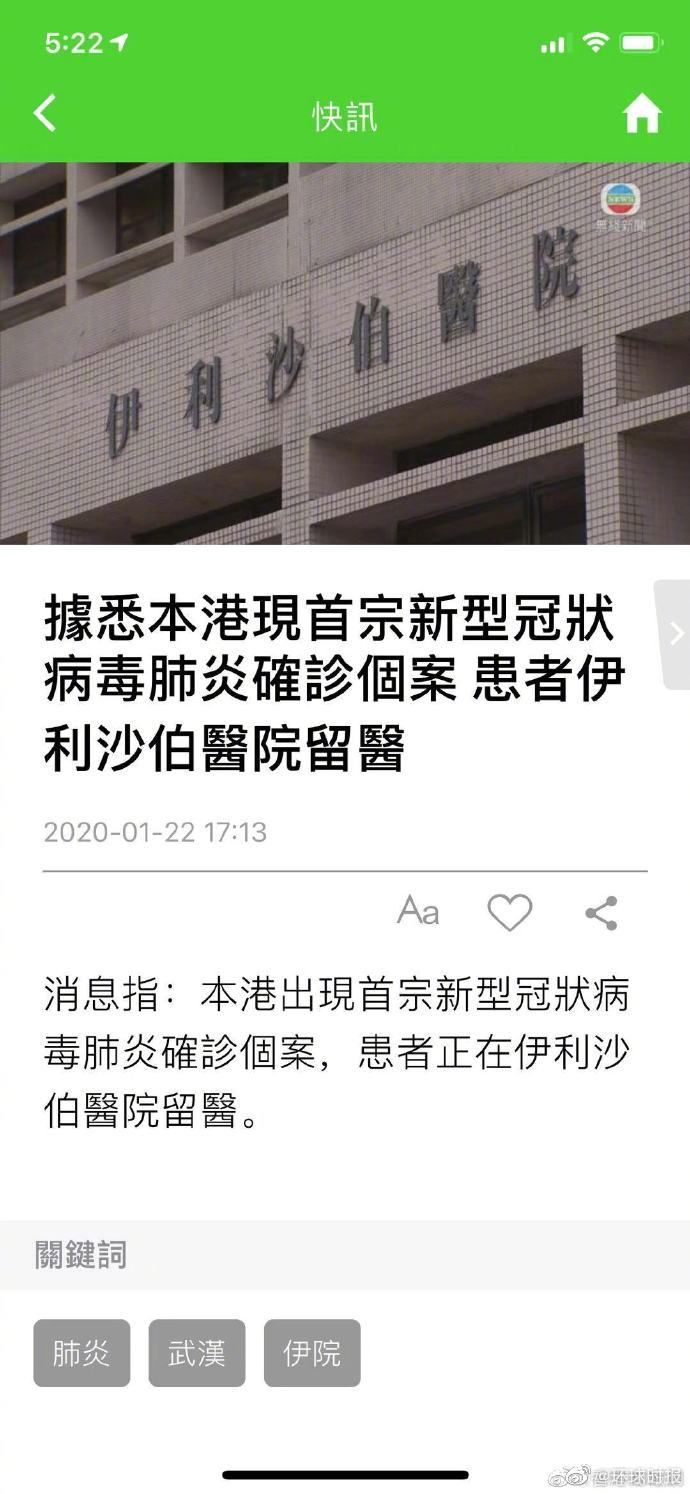 据香港无线新闻1月22日17时许消息,香港出现首宗新型冠狀病毒肺炎确诊个案,患者正在伊利沙伯医院留医治疗。