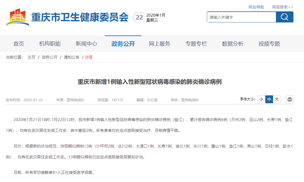 荔枝新闻讯 2020年1月21日18时-1月22日12时,重庆市新增1例输入性新型冠状病毒感染的肺炎确诊病例(垫江),累计报告确诊病例6例(万州2例、巫山2例、长寿1例、垫江1例),均有在武汉居住史或工作史,其中重症2例。所有患者均在定点医院接受治疗,目前病情平稳。