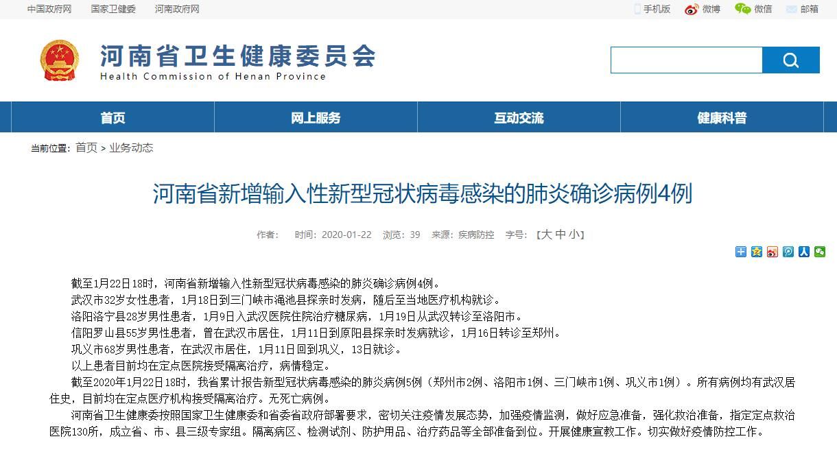 截至2020年1月22日18时,我省累计报告新型冠状病毒感染的肺炎病例5例(郑州市2例、洛阳市1例、三门峡市1例、巩义市1例)。所有病例均有武汉居住史,目前均在定点医疗机构接受隔离治疗。无死亡病例。
