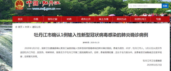 荔枝新闻讯 据黑龙江省牡丹江市卫生健康委员会官网消息,2020年1月23日,国家卫生健康委确认黑龙江省首例输入性新型冠状病毒感染的肺炎确诊病例。患者为男性,69岁,牡丹江市人。1月12日从武汉市返回牡丹江市后,因发热、咳嗽咳痰、周身乏力于牡丹江市第二医院隔离治疗。目前,患者病情较重,正处于全力救治中。该患者密切接触者正在医学观察,目前暂无异常。