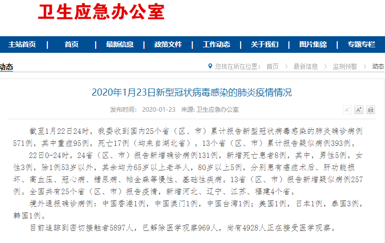 荔枝新闻讯 1月23日,国家卫健委通报新型冠状病毒感染的肺炎疫情最新情况:截至1月22日24时,我委收到国内25个省(区、市)累计报告新型冠状病毒感染的肺炎确诊病例571例,其中重症95例,死亡17例(均来自湖北省)。13个省(区、市)累计报告疑似病例393例。