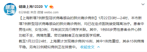 截至1月22日24时,上海累计发现确诊病例16例,其中1例危重症,其余15例病情平稳。另有22例疑似病例正在排查中。