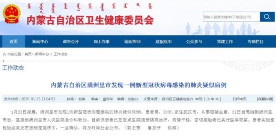荔枝新闻讯 据内蒙古自治区卫健委网站消息,1月23日凌晨,满洲里市发现1例新型冠状病毒感染的肺炎疑似病例。患者男,30岁,家住武汉市,从事服装生意,21日自驾游到满洲里市后,直接到满洲里市人民医院急诊科就诊。