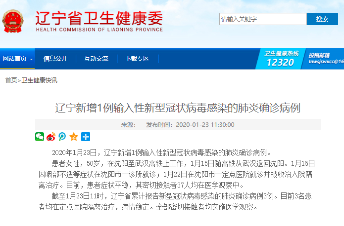 截至1月23日11时,辽宁省累计报告新型冠状病毒感染的肺炎确诊病例3例。目前3名患者均在定点医院隔离治疗,病情稳定。全部密切接触者均实施医学观察。