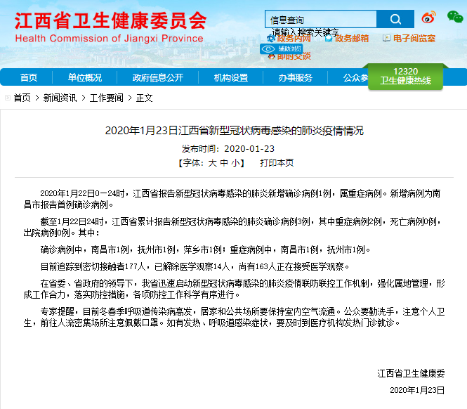 截至1月22日24时,江西省累计报告新型冠状病毒感染的肺炎确诊病例3例,其中重症病例2例,死亡病例0例,出院病例0例。其中: