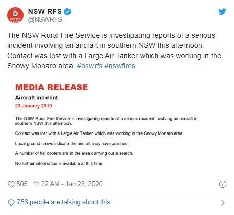 据报道,澳大利亚新南威尔士农村消防局23日表示,当局“正在调查有关今天下午在新南威尔士州南部发生的一起飞机严重事故”。“在斯诺伊莫纳罗地区工作的一架救火飞机与地面失去了联系。”