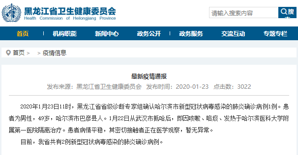 荔枝新闻讯 2020年1月23日11时,黑龙江省省级诊断专家组确认哈尔滨市新型冠状病毒感染的肺炎确诊病例1例。患者为男性,49岁,哈尔滨市巴彦县人。1月22日从武汉市抵哈后,即因咳嗽、咯痰、发热于哈尔滨医科大学附属第一医院隔离治疗。患者病情平稳,其密切接触者正在医学观察,暂无异常。