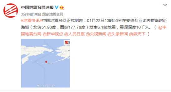 中国地震台网正式测定:01月23日13时53分在安德烈亚诺夫群岛附近海域(北纬51.93度,西经177.78度)发生6.1级地震,震源深度10千米。