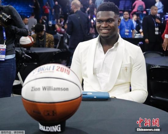 资料图:当地时间2019年6月20日,NBA选秀大会在纽约举行,鹈鹕用状元签选中来自杜克大学的锡安·威廉森。图为选秀开始前的锡安·威廉森。