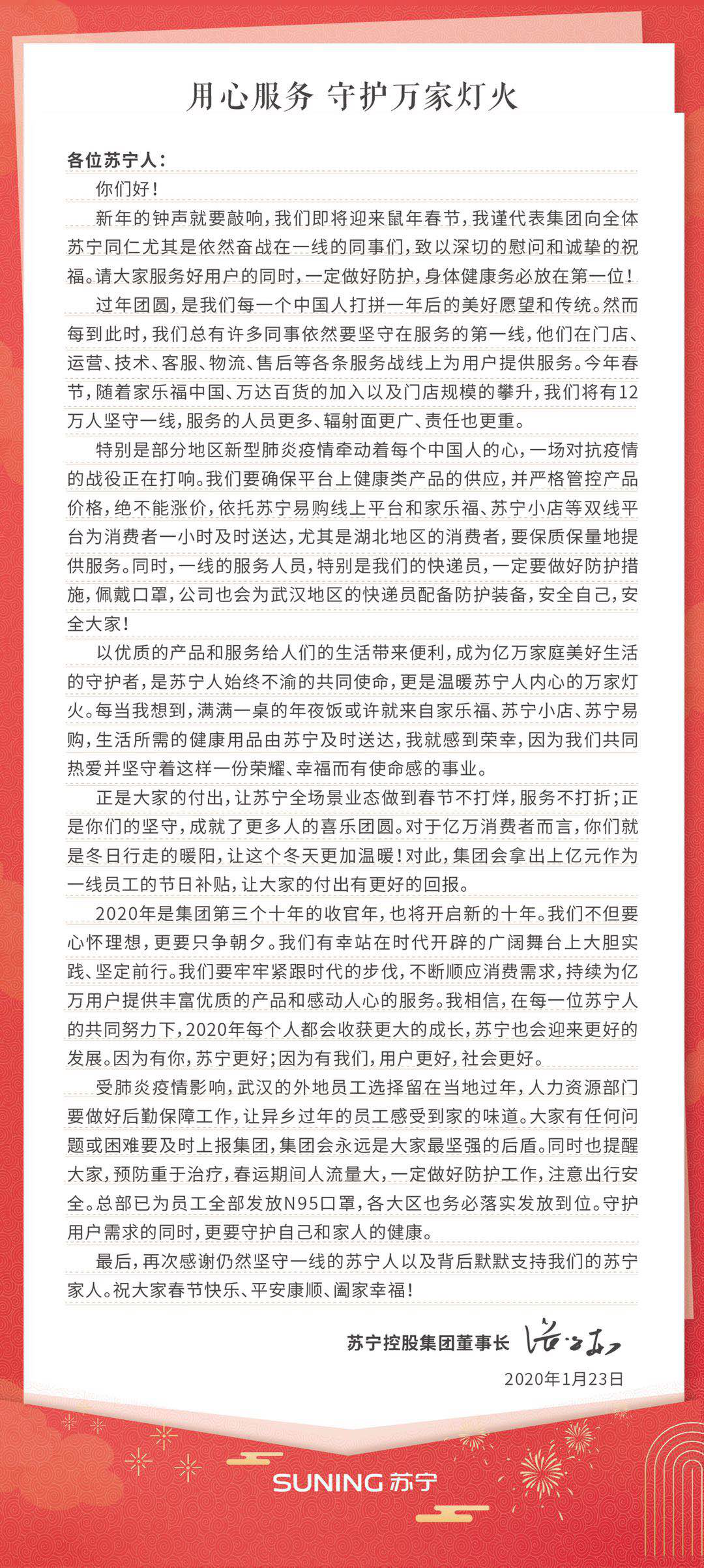 1月23日,张近东发表致苏宁一线员工的春节慰问信,尤其面向湖北区域的员工,要求人力资源做好服务保障,嘱托员工务必注意安全!信中,张近东还表示,今年春节,苏宁将有12万员工坚守一线为全国用户服务。