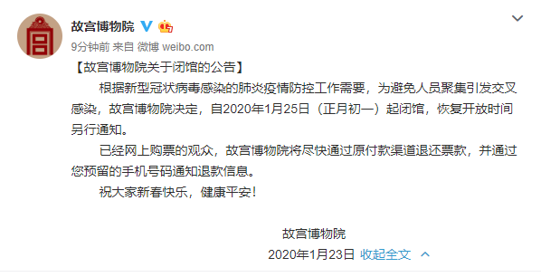 荔枝新闻讯 据故宫博物院官方微博消息,根据新型冠状病毒感染的肺炎疫情防控工作需要,为避免人员聚集引发交叉感染,故宫博物院决定,自2020年1月25日(正月初一)起闭馆,恢复开放时间另行通知。