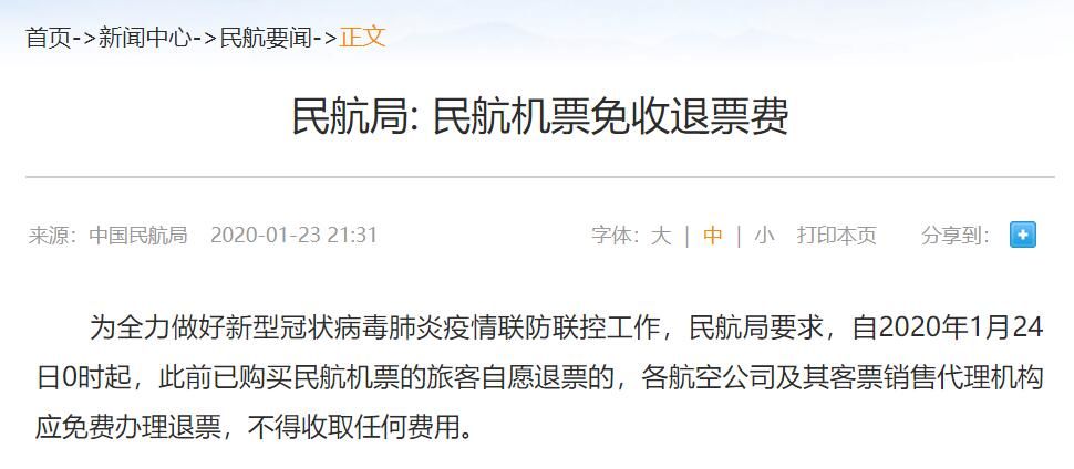 荔枝新闻讯 据中国民航局网站消息,为全力做好新型冠状病毒肺炎疫情联防联控工作,民航局要求,自2020年1月24日0时起,此前已购买民航机票的旅客自愿退票的,各航空公司及其客票销售代理机构应免费办理退票,不得收取任何费用。
