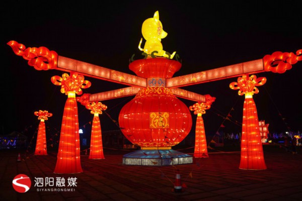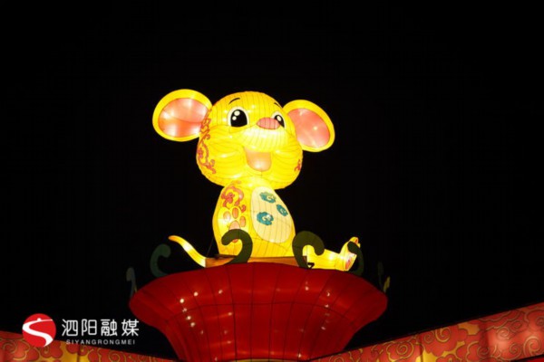 灯会的核心开心鼠,又叫做鼠年迎春、开门大吉,中间是一个大型的艺术花瓶,寓意着平平安安,再配以四根横梁,横梁上面有朵朵祥云,寓意为纳四方祥瑞。