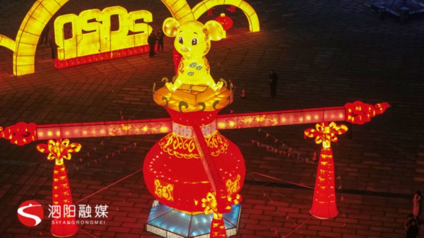 瞧!一组组火红的灯笼带来喜庆的感觉。一排排树上灯带齐放光芒,好似火树银花,一个个以鼠元素为主题,打造出如梦如幻的流光世界。