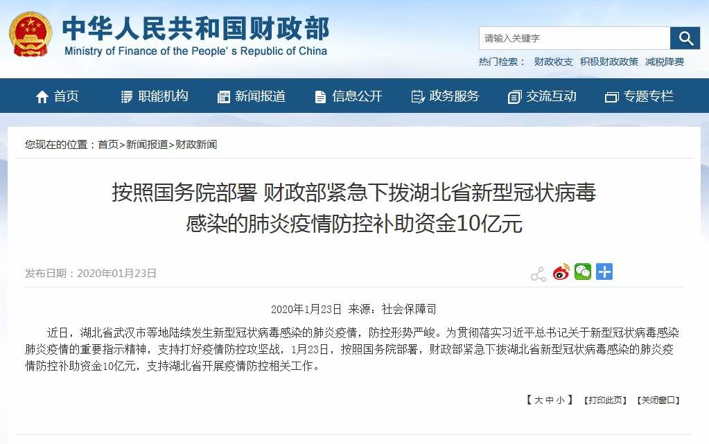 近日,湖北省武汉市等地陆续发生新型冠状病毒感染的肺炎疫情,防控形势严峻。为贯彻落实习近平总书记关于新型冠状病毒感染肺炎疫情的重要指示精神,支持打好疫情防控攻坚战,1月23日,按照国务院部署,财政部紧急下拨湖北省新型冠状病毒感染的肺炎疫情防控补助资金10亿元,支持湖北省开展疫情防控相关工作。
