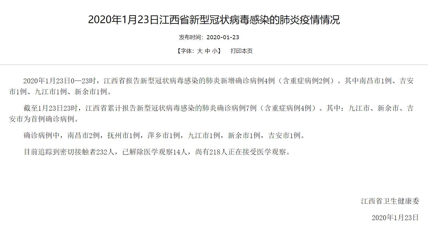 荔枝新闻讯 据江西卫健委网站通报,2020年1月23日0—23时,江西省报告新型冠状病毒感染的肺炎新增确诊病例4例(含重症病例2例)。其中南昌市1例、吉安市1例、九江市1例、新余市1例。