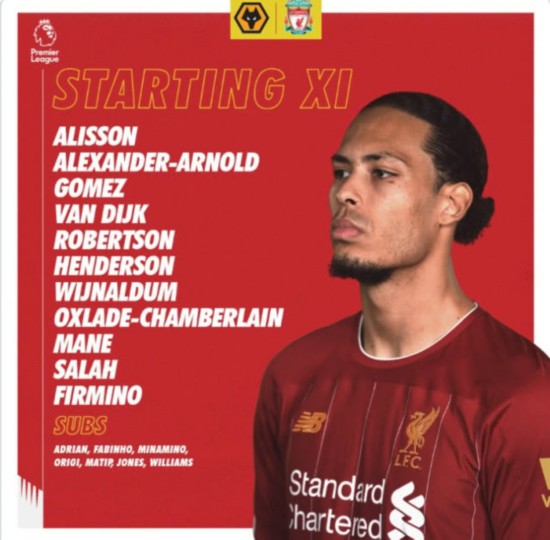 腾讯体育讯 北京时间1月24日凌晨4时,2019-2020赛季英超第24轮,利物浦做客挑战狼队,双方首发阵容已经公布。