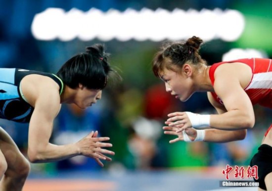 资料图:里约奥运会摔跤女子自由式半决赛,中国选手孙亚楠(蓝)负于日本选手登坂绘莉。 中新网记者 杜洋 摄