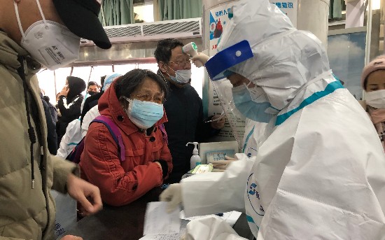1月23日,武汉红十字会医院,“全副武装”的医护人员正为患者检查体温。