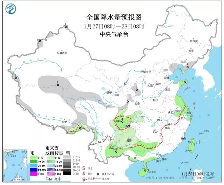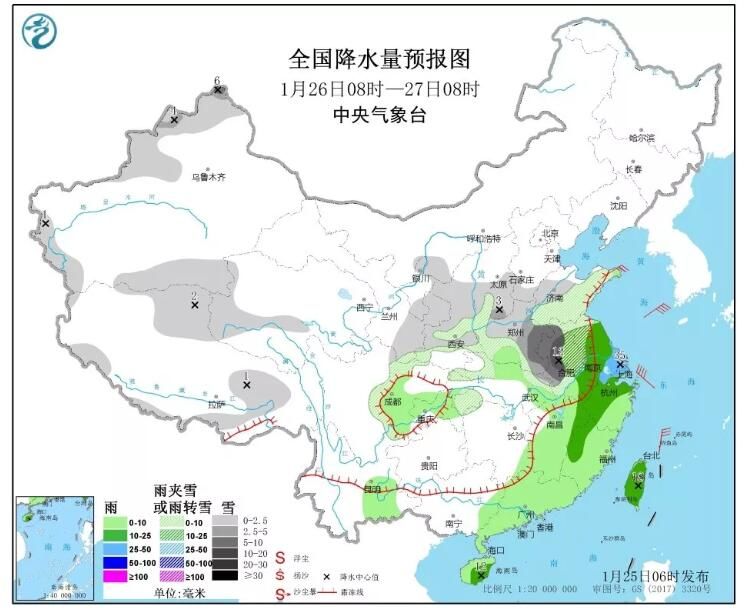 全国范围内天气:预计今天(26日),黄河以南仍有大范围雨雪天气,其中河南、安徽等地有强降雪;湖南、江西等局地有暴雨。气温方面,由于冷空气实力较弱,全国大部气温变化不剧烈,仅在云南至华南一带,气温变化较大,26日前后气温将转为较常年同期偏低水平,提醒您注意加强保暖。