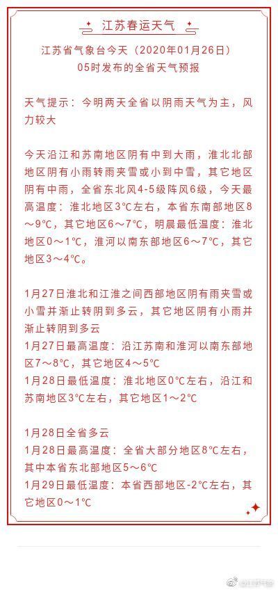 今天沿江和苏南地区阴有中到大雨,淮北北部地区阴有小雨转雨夹雪或小到中雪,其它地区阴有中雨,全省东北风4-5级阵风6级,今天最高温度:淮北地区3℃左右,本省东南部地区8~9℃,其它地区6~7℃,明晨最低温度:淮北地区0~1℃,淮河以南东部地区6~7℃,其它地区3~4℃。