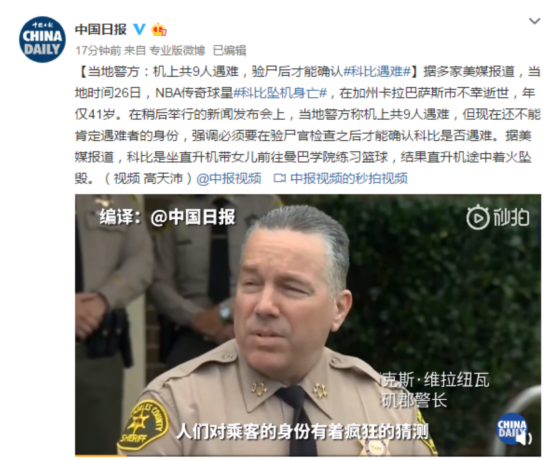 【当地警方:机上共9人遇难,验尸后才能确认#科比遇难#】据多家美媒报道,当地时间26日,NBA传奇球星#科比坠机身亡#,在加州卡拉巴萨斯市不幸逝世,年仅41岁。在稍后举行的新闻发布会上,当地警方称机上共9人遇难,但现在还不能肯定遇难者的身份,强调必须要在验尸官检查之后才能确认科比是否遇难。据美媒报道,科比是坐直升机带女儿前往曼巴学院练习篮球,结果直升机途中着火坠毁。
