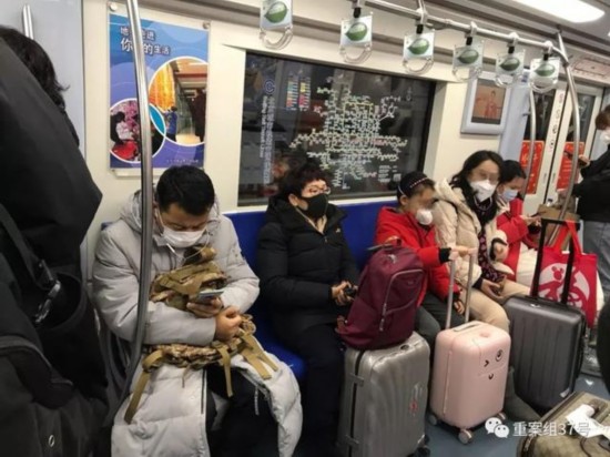 北京地铁,返乡的人们纷纷佩戴口罩。