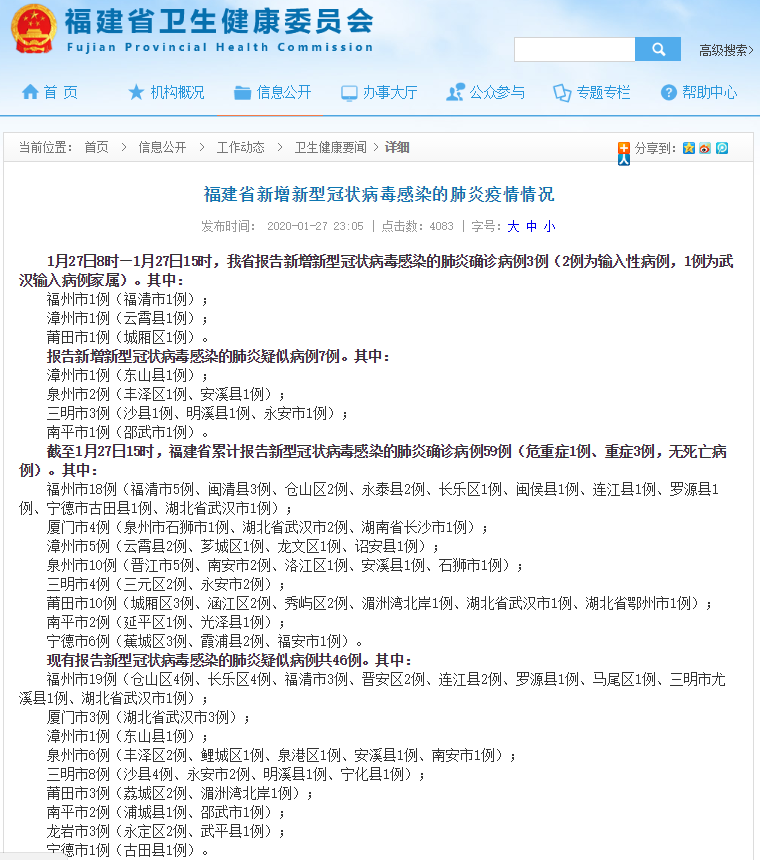 截至1月27日15时,福建省累计报告新型冠状病毒感染的肺炎确诊病例59例(危重症1例、重症3例,无死亡病例)。其中: