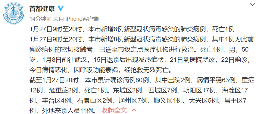 荔枝新闻讯 北京市卫健委发布消息,1月27日9时至20时,本市新增8例新型冠状病毒感染的肺炎病例,其中1例为此前确诊病例的密切接触者,已送至市级定点医疗机构进行救治。死亡1例,男,50岁,1月8日前往武汉,15日返京后出现发热症状,21日到医院就诊,22日确诊,今日病情恶化,因呼吸功能衰竭,经抢救无效死亡。