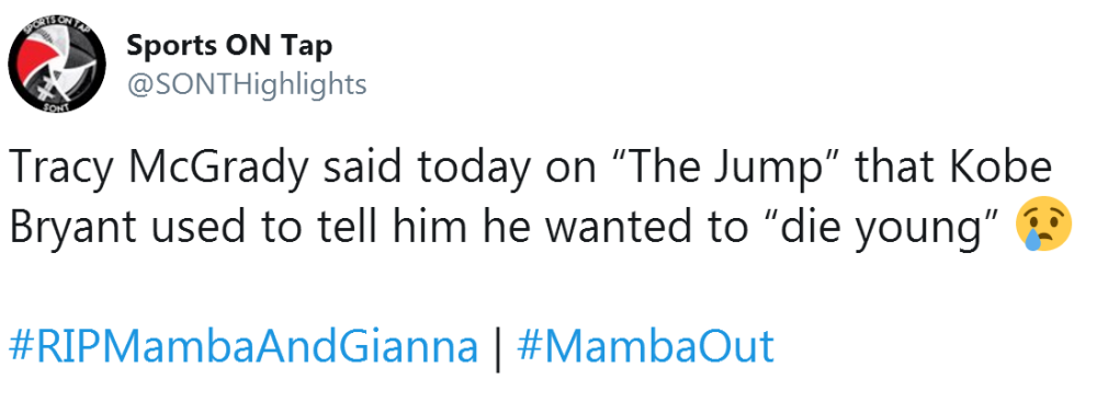 “这听起来有些疯狂,但是科比以前说过这个,他说他想要英年早逝(I want to die young),”麦蒂难过地说道。
