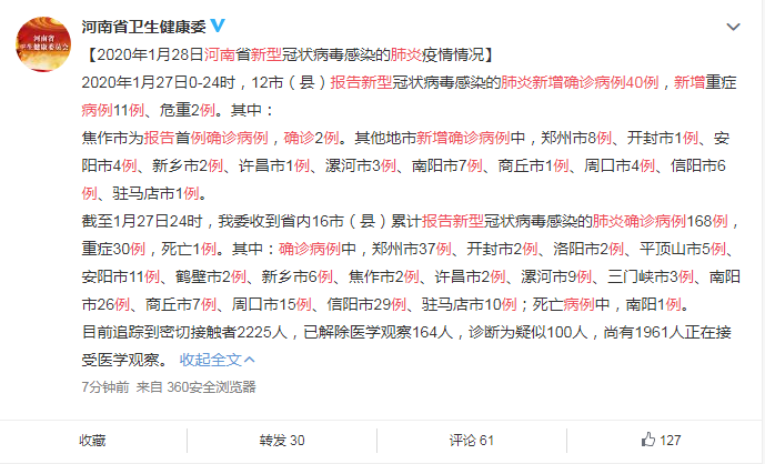 截至1月27日24时,我委收到省内16市(县)累计报告新型冠状病毒感染的肺炎确诊病例168例,重症30例,死亡1例。其中:确诊病例中,郑州市37例、开封市2例、洛阳市2例、平顶山市5例、安阳市11例、鹤壁市2例、新乡市6例、焦作市2例、许昌市2例、漯河市9例、三门峡市3例、南阳市26例、商丘市7例、周口市15例、信阳市29例、驻马店市10例;死亡病例中,南阳1例。