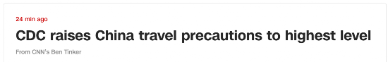 美国有线电视新闻网(CNN)最新消息,美国疾病控制与预防中心(CDC)当地时间27日将针对中国的旅行预防措施提升至“警告”的最高级别。这意味着建议旅行者“避免不必要的旅行”。