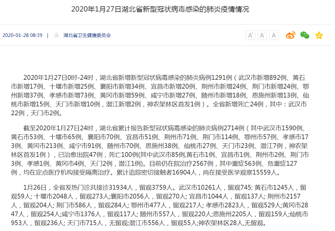 截至2020年1月27日24时,湖北省累计报告新型冠状病毒感染的肺炎病例2714例(其中武汉市1590例、黄石市53例、十堰市65例、襄阳市70例、宜昌市51例、荆州市71例、荆门市114例、鄂州市57例、孝感市173例、黄冈市213例、咸宁市91例、随州市70例、恩施州38例、仙桃市27例、天门市23例、潜江7例,神农架林区首发1例),已治愈出院47例,死亡100例(其中武汉市85例,黄石市1例、宜昌市1例、荆州市2例、荆门市3例、孝感1例、黄冈市4例、天门2例,潜江1例)。目前仍在院治疗2567例,其中重症563例、危重症127例,均在定点医疗机构接受隔离治疗。累计追踪密切接触者16904人,尚在接受医学观察15559人。