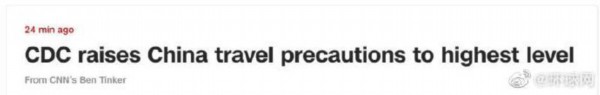 美国有线电视新闻网(CNN)最新消息,美国疾病控制与预防中心(CDC)当地时间27日将针对中国的旅行预防措施提升至“警告”的最高级别。这意味着建议旅行者“避免不必要的旅行”。