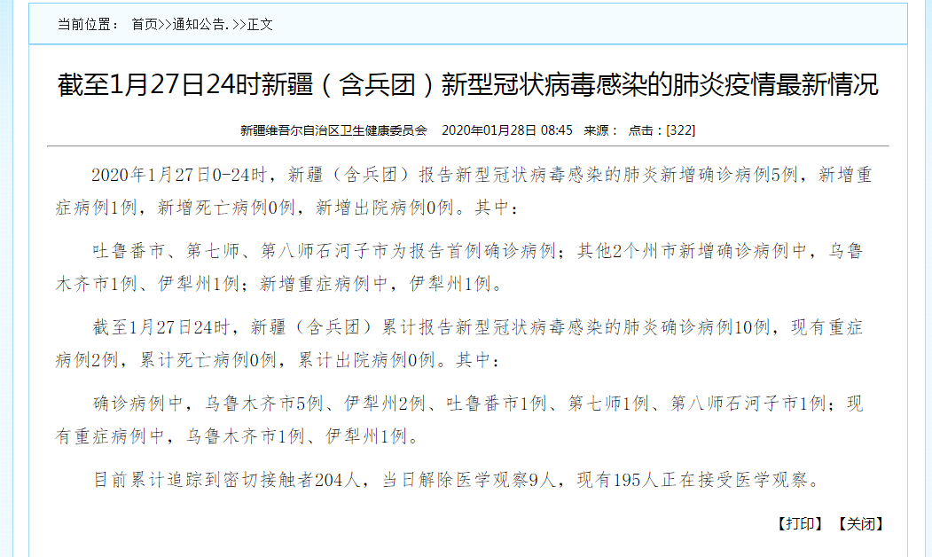 截至1月27日24时,新疆维吾尔自治区累计报告新型冠状病毒感染的肺炎确诊病例10例,现有重症病例2例,累计死亡病例0例,累计出院病例0例。其中: