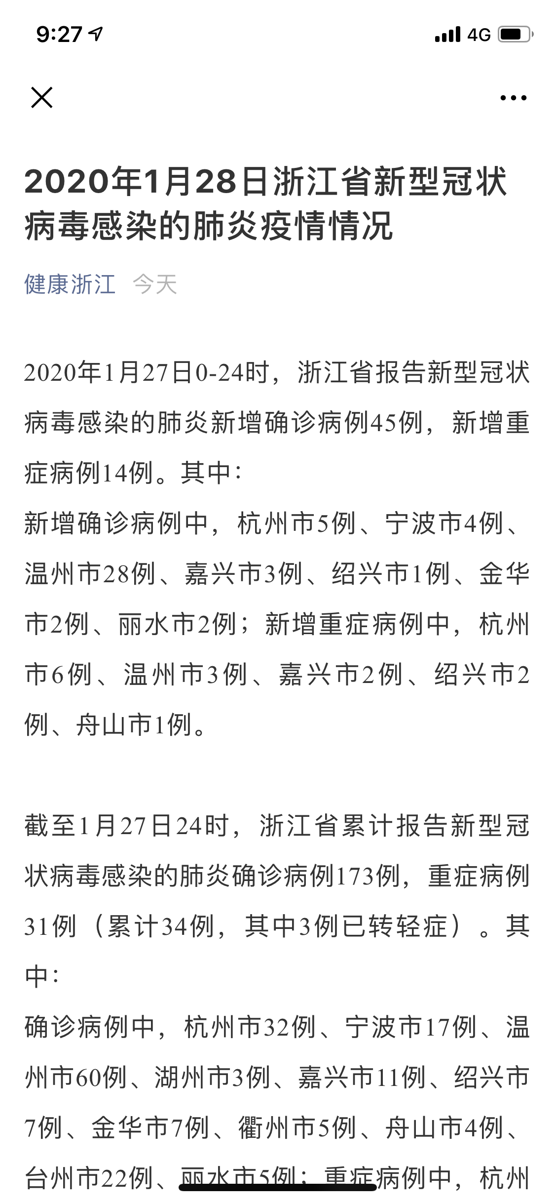 截至1月27日24时,浙江省累计报告新型冠状病毒感染的肺炎确诊病例173例,重症病例31例(累计34例,其中3例已转轻症)。其中: