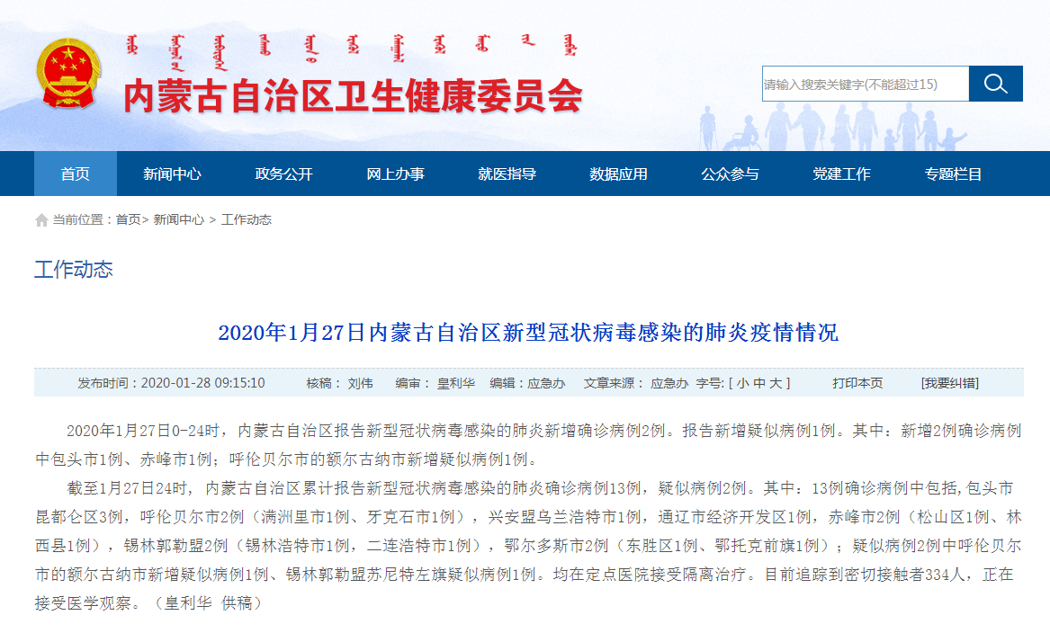 截至1月27日24时,内蒙古自治区累计报告新型冠状病毒感染的肺炎确诊病例13例,疑似病例2例。其中:13例确诊病例中包括,包头市昆都仑区3例,呼伦贝尔市2例(满洲里市1例、牙克石市1例),兴安盟乌兰浩特市1例,通辽市经济开发区1例,赤峰市2例(松山区1例、林西县1例),锡林郭勒盟2例(锡林浩特市1例,二连浩特市1例),鄂尔多斯市2例(东胜区1例、鄂托克前旗1例);疑似病例2例中呼伦贝尔市的额尔古纳市新增疑似病例1例、锡林郭勒盟苏尼特左旗疑似病例1例。均在定点医院接受隔离治疗。目前追踪到密切接触者334人,正在接受医学观察。