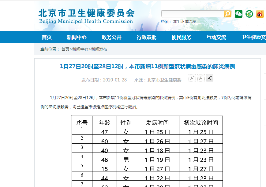 荔枝新闻讯 据北京市卫健委消息,1月27日20时至28日12时,北京市新增11例新型冠状病毒感染的肺炎病例,其中5例有湖北接触史,7例为此前确诊病例的密切接触者,均已送至市级定点医疗机构进行救治。